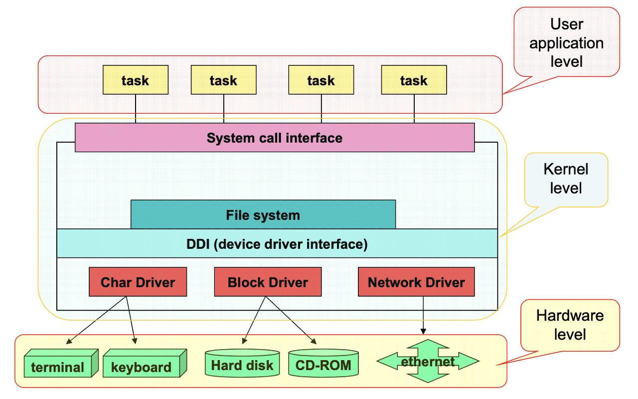 | 특수 목적 | 디바이스 파일 | - 하드웨어 단에 있는 특정 물리적인 디바이스를 정형화된 인터페이스를 통해 접근할 수 있도록 해주는 파일 - 아래 그림에서 볼 수 있듯이 디바이스 파일은 커널 수준에서 동작하며 사용자는 DDI를 통해 디바이스 파일에 접근하여 장치를 관리할 수 있음 ![]() 출처 : 리눅스 디바이스 드라이버 프로그래밍 - 예를 들어, 사용자가 마우스를 클릭할 때(task), 커널에서 system call interface를 통해 VFS 파일 시스템(File system)을 이용하여 DDI로 접근하며, 특정 드라이버를 이용하여 mouse라는 디바이스 를 이용할 수 있습니다. - 자세한 내용은 리눅스 디바이스 드라이버 프로그래밍에 나와있으니 참고 부탁드립니다. |