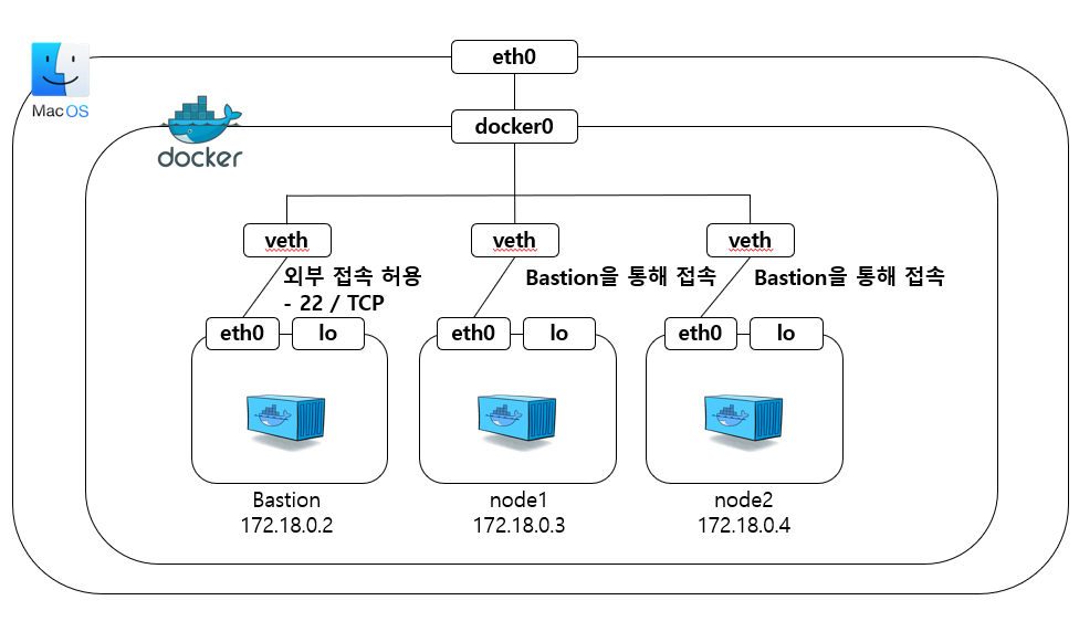 컨테이너를 브리지 방식으로 구성한 이유는 포트를 이용한 외부와의 통신을 비롯하여 내부 컨테이너 간 SSH 연결을 허용해야되기 때문입니다. 자세한건 '컨테이너 네트워크 방식'을 참조하면 좋을 것 같습니다.