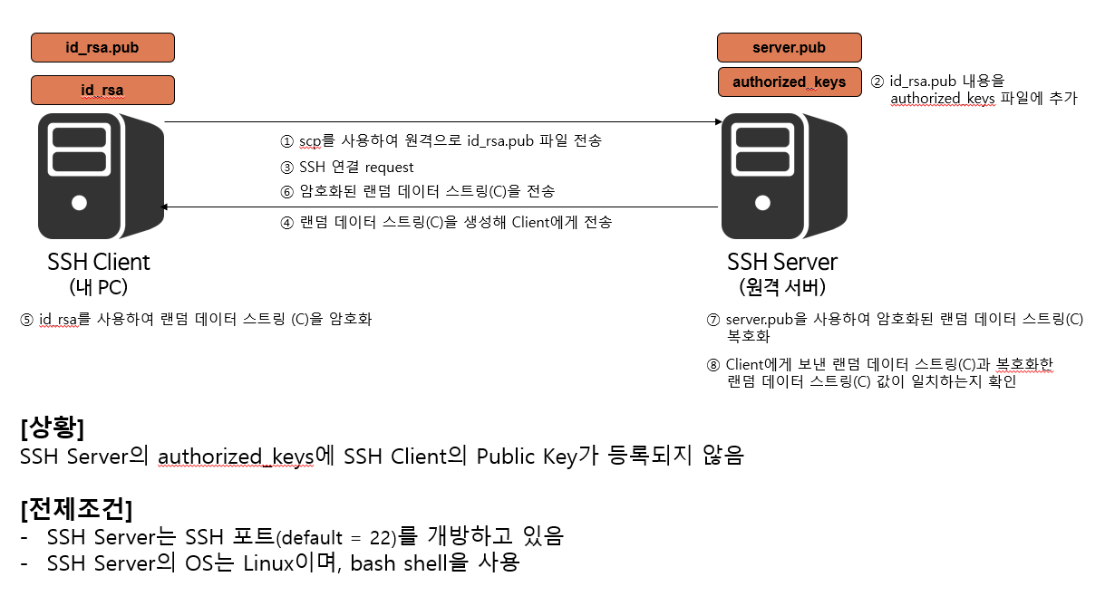 서버에서 사용할 인증 방식은 /etc/sshd_config 파일에서 수정이 가능하며 root 직접 접근 등에 대한 설정도 해당 파일에서 변경이 가능합니다. 위 2가지 중 가장 보안이 좋은 방식은 공개키 암호화 방식을 이용한 사용자 인증 방식입니다. 해당 방식을 리눅스 SSH 연결 인증으로 적용할 경우 사용자가 접속한 PC인 SSH Client와 원격지 서버인 SSH Server는 아래와 같은 순서로 구성 및 동작합니다.