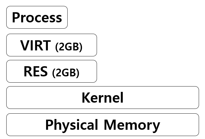 즉 특정 프로세스가 커널로부터 RES, VIRT, SHR를 할당받고 실제 물리 영역의 메모리에서 사용하는 공간은 RES를 통해 확인할 수 있습니다. 따라서 top 명령어를 통해 메모리 점유율이 높은 프로세스를 찾고싶을 경우 RES값이 높은 프로세스를 찾으면 됩니다. 위에서 각 용어 별로 최대 메모리라고 표현한 이유는 프로세스가 최대로 사용 가능한 메모리 크기를 의미하기 때문입니다. 즉, 커널로부터 사용을 예약받은 메모리 크기입니다. 해당 개념은 디스크의 thin provisioning과 유사한 느낌을 가지고 있습니다. 이를 그림으로 표현하면 아래와 같습니다.